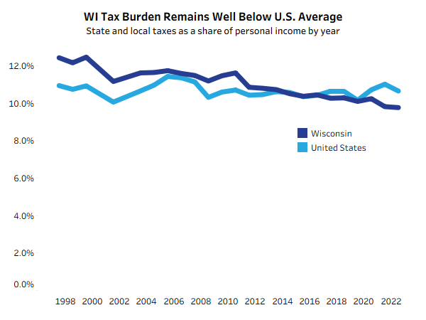 Wisconsin’s state and local tax burden fell slightly in 2023 to a new all-time low, driven by property tax limits, strong income growth, and modest income tax cuts. Over the last quarter-century, Wisconsin has gone from one of the nation’s highest tax burdens to well below average, and has also seen its spending levels and rankings drop in areas such as K-12 education. But this major shift in policy is becoming more difficult to continue.